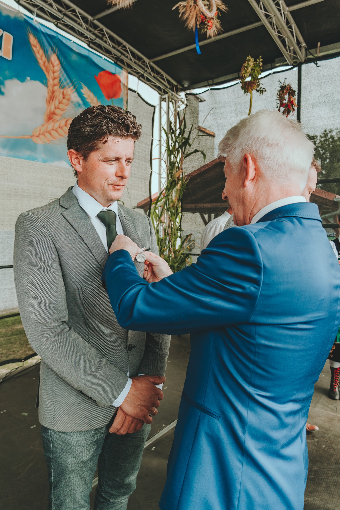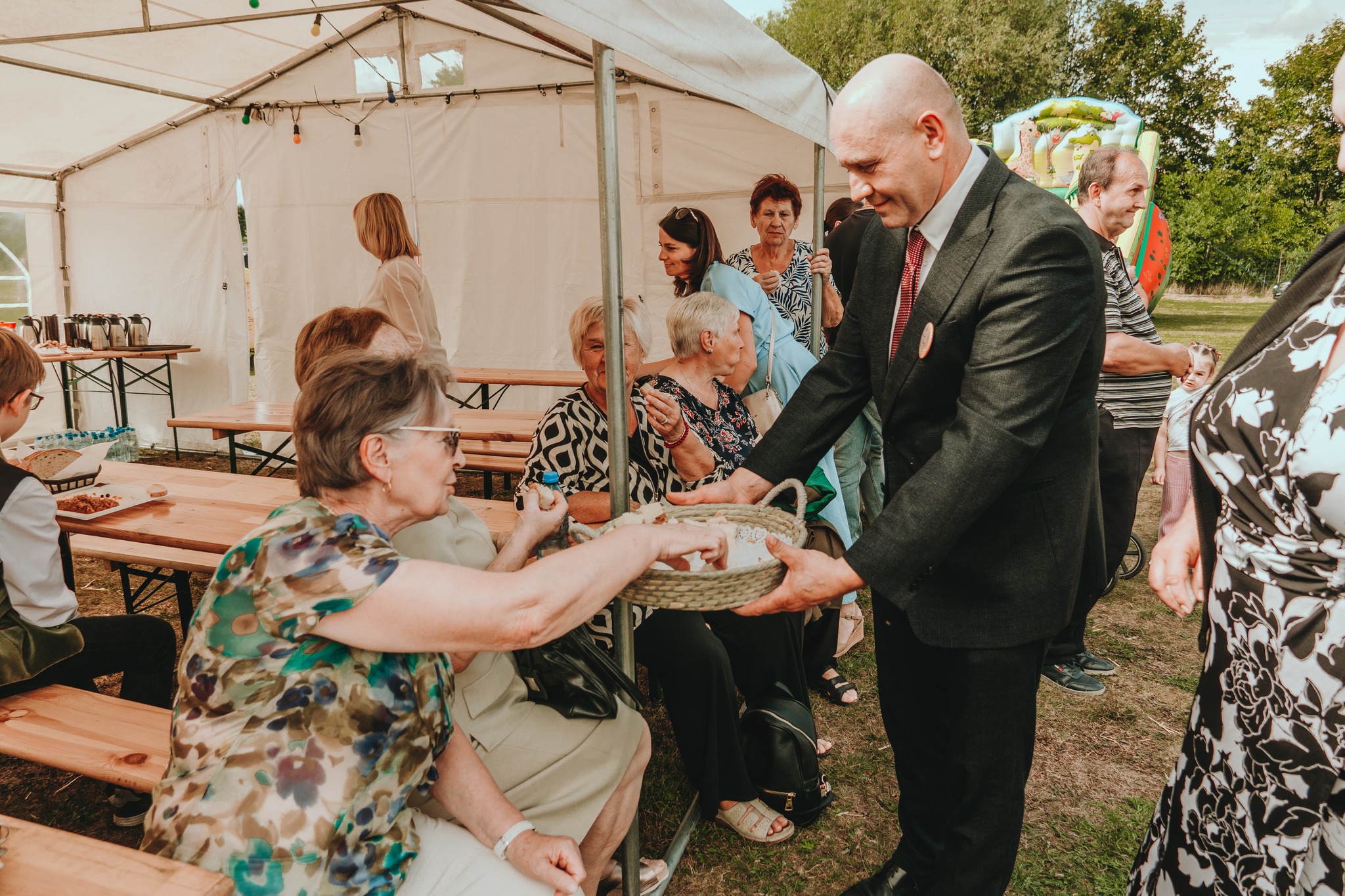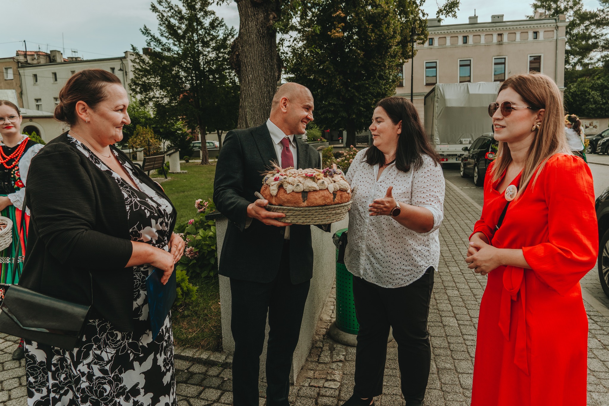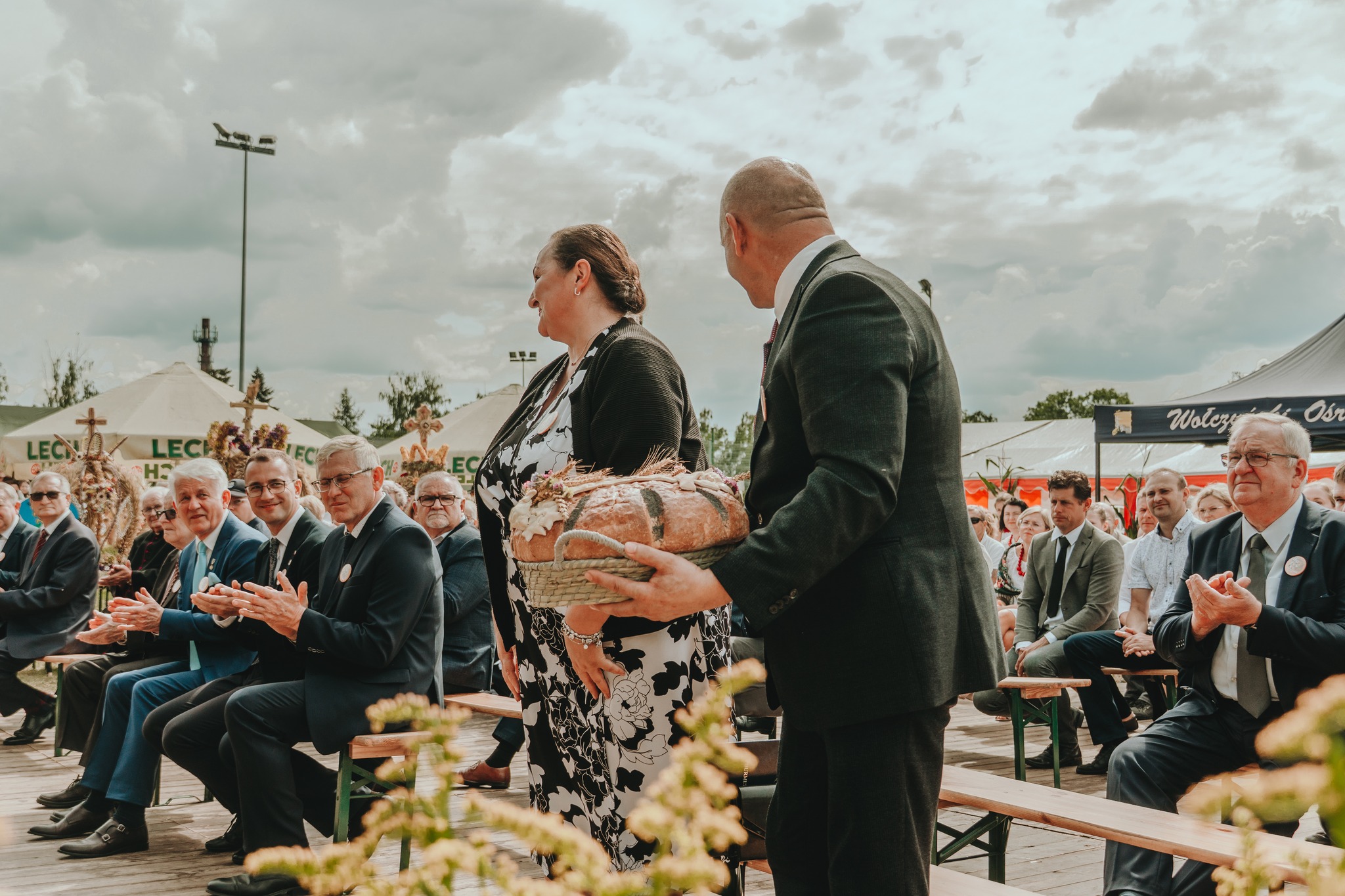 Chleb został wręczony Burmistrzowi Wołczyna, Panu Janowi Leszkowi Wiąckowi, który następnie częstował nim wszystkich mieszkańców. W przemówieniach padło wiele ciepłych słów pod adresem naszych rolników – za ich codzienny trud, miłość do ziemi i szacunek do tradycji.