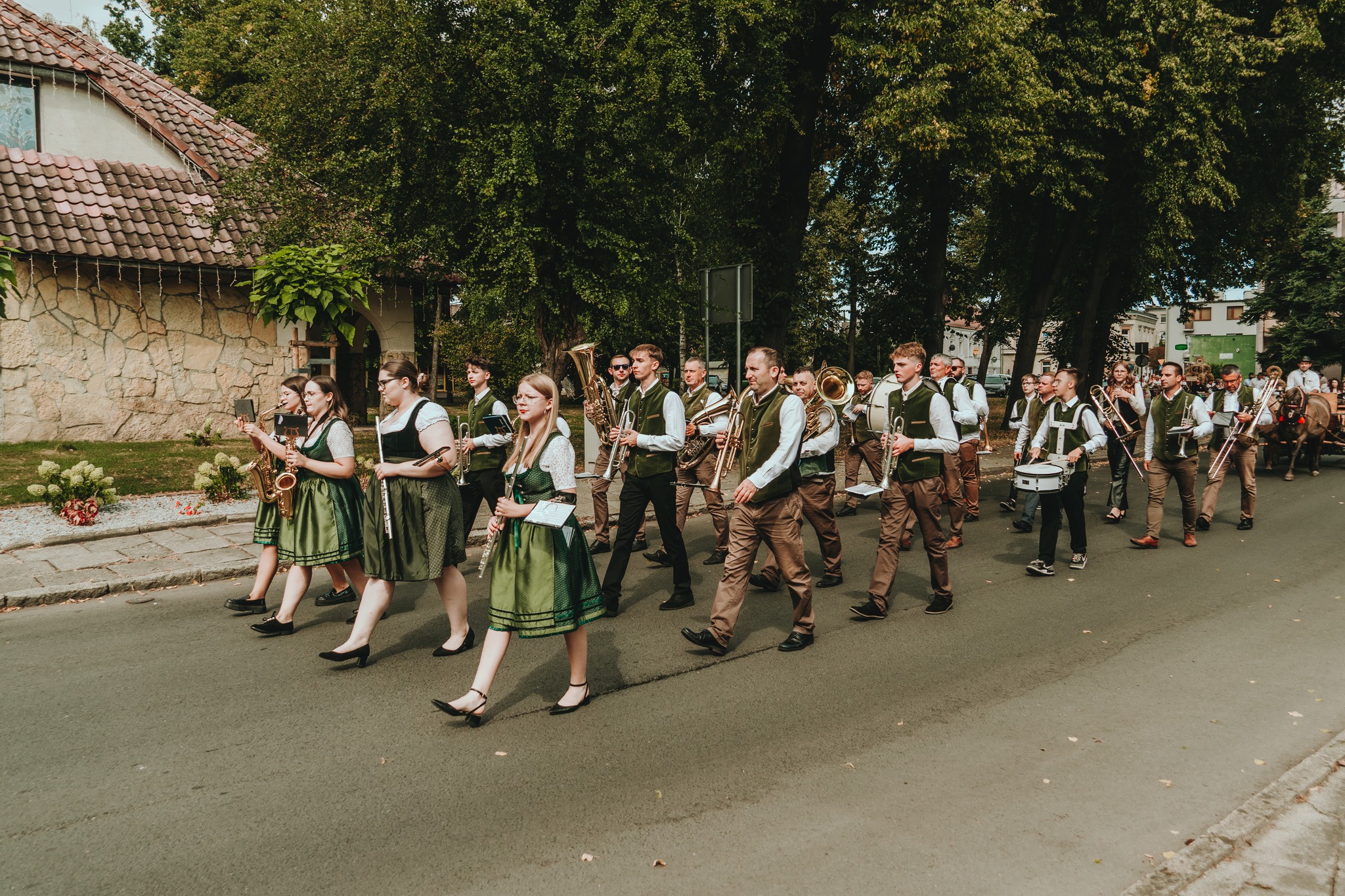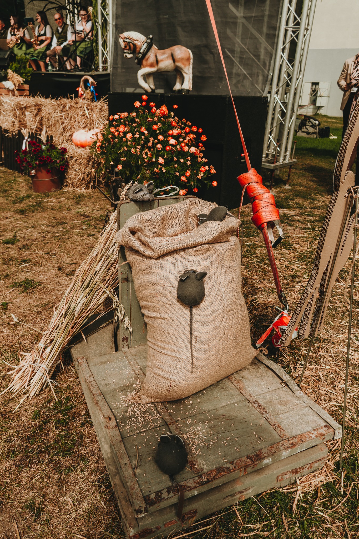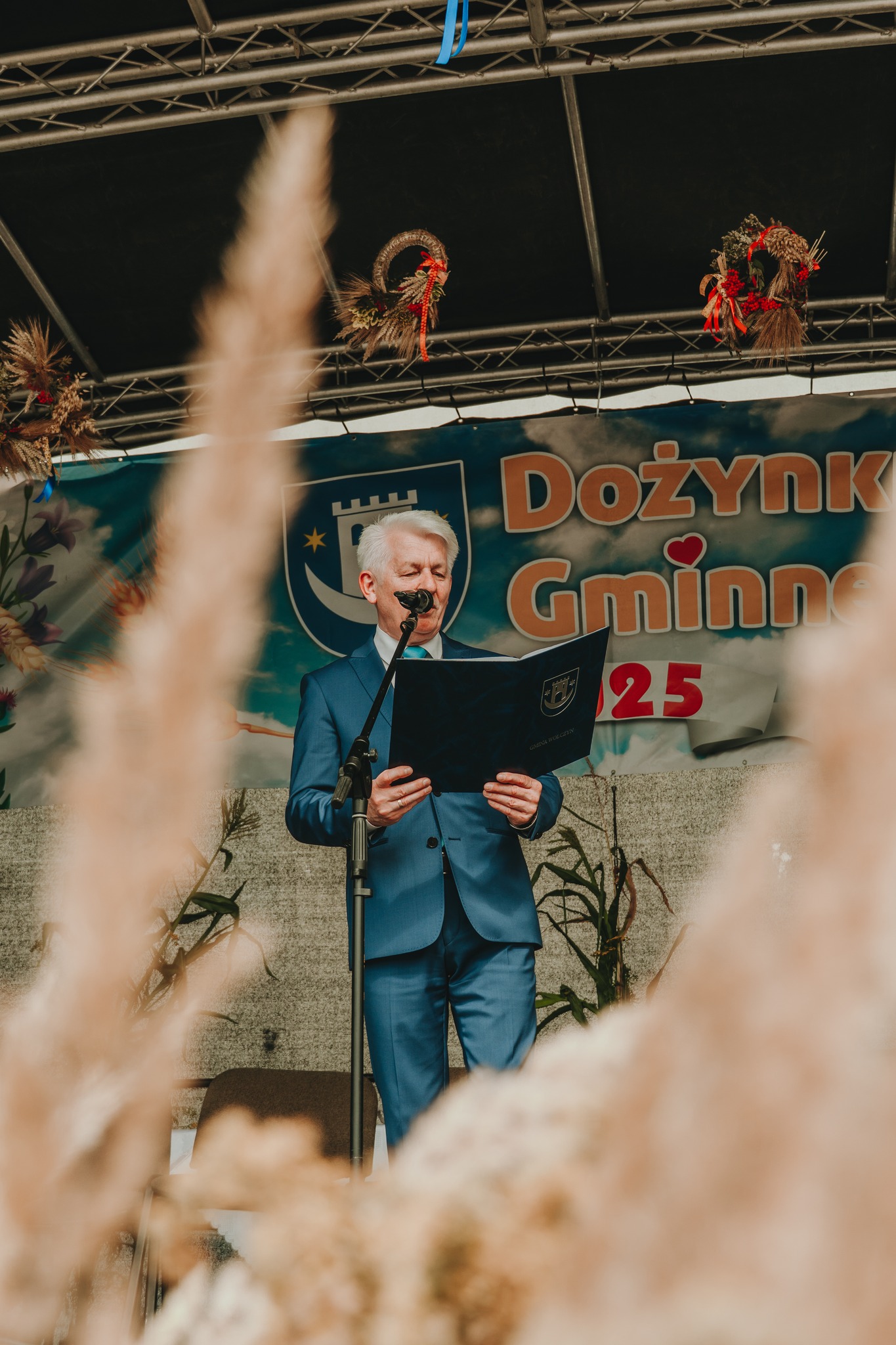 – święto będące ukoronowaniem całorocznego trudu rolników, pełne tradycji, wzruszeń, wspólnego świętowania i dobrej energii. Dziękujemy każdej osobie, która była z nami tego dnia! Uroczystość rozpoczęła się Mszą Świętą dziękczynną w Kościele pw. św. Teresy w Wołczynie, celebrowaną przez proboszcza br. Tomasza Grabca, któremu składamy serdeczne podziękowania. Po Mszy barwny korowód dożynkowy, w asyście Orkiestry Dętej z Bażan, przemaszerował na teren imprezy. Orkiestra wykonała uroczyste otwarcie muzyczne – za tę wspaniałą oprawę dziękujemy z całego serca! Szczególne podziękowania kierujemy do Pana Andrzeja Olejnika, który udostępnił swoją piękną bryczkę z zaprzęgiem konnym – to właśnie nią uroczyście przewieziono Starostów Dożynek. Ten wyjątkowy akcent dodał wydarzeniu elegancji i tradycyjnego uroku – dziękujemy! Część oficjalna rozpoczęła się symbolicznym przekazaniem chleba – przygotowanego z tegorocznych plonów – przez Starostów Dożynek, Państwa Joannę i Jana Hreczyńskich z Gierałcic.