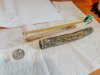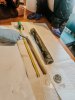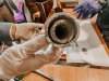 Dokonano odcięcia wycinka metalowej tuby o długości ok. 35 cm i średnicy 4,6 cm. W miejscu odcięcia stwierdzono występowanie szklanego opakowania i wydobyto z niego zwój o długości 33 cm.